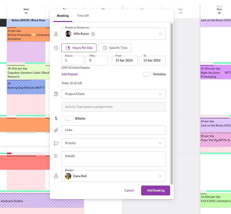 Project/Client - Specify the Project or Client of a booking, if required. If you have sufficient permissions you can also create new projects and clients on the fly here, by selecting New Project or New Client in this drop down menu.