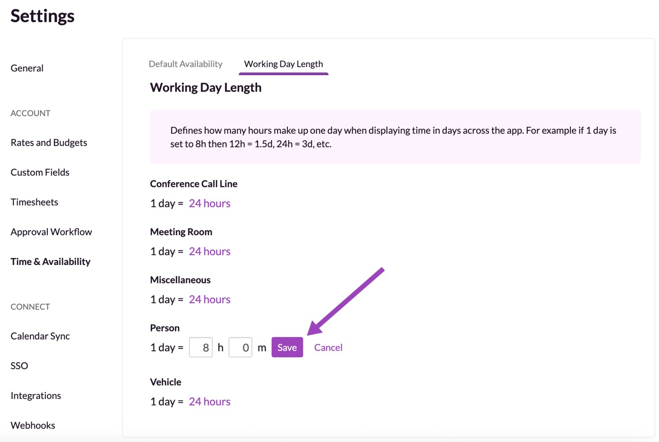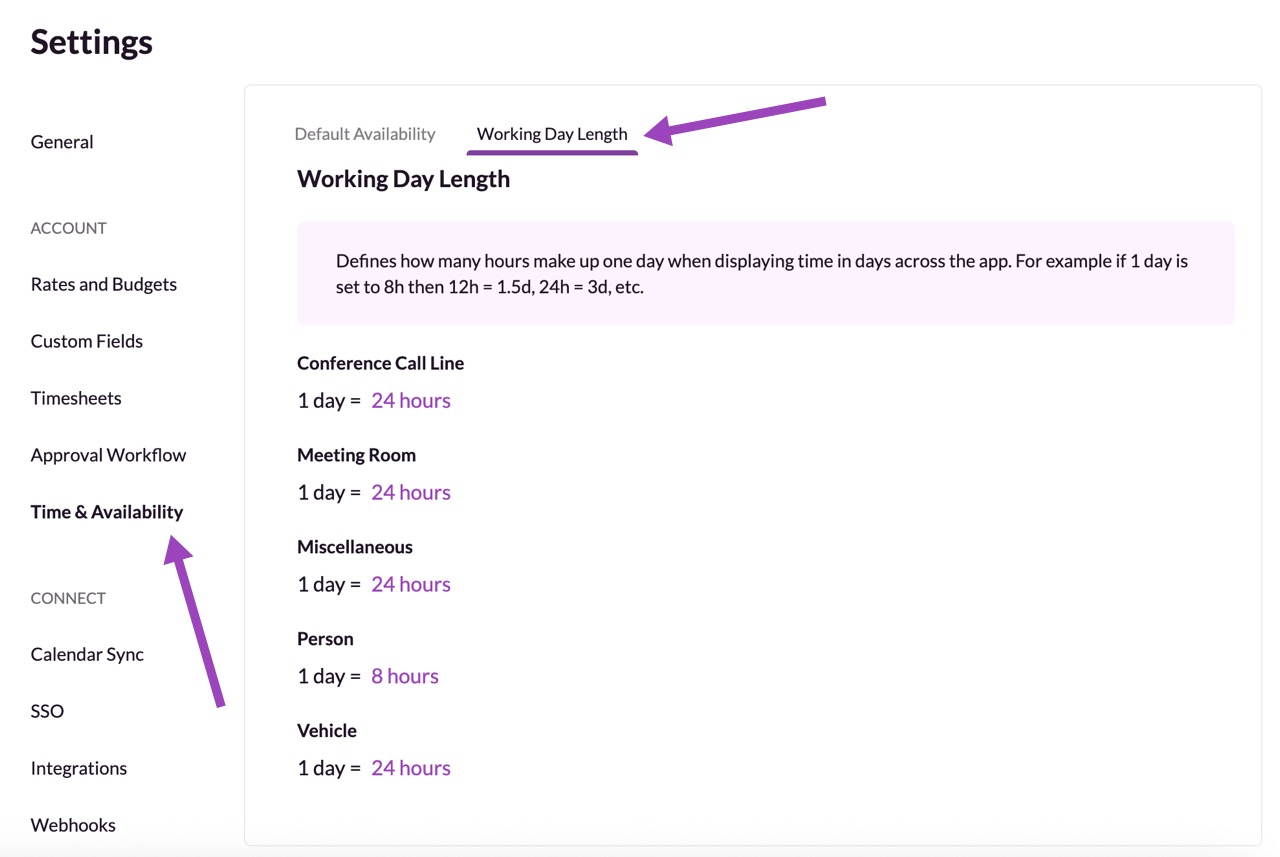 Your reports will display data in days as well as hours, depending on your preferences. By default, the number of hours in a day for people resources is 8, and for non-human resources it is 24. But not every company has the same number of hours in a day. So, you can configure the right number of hours for your company over in your Settings.