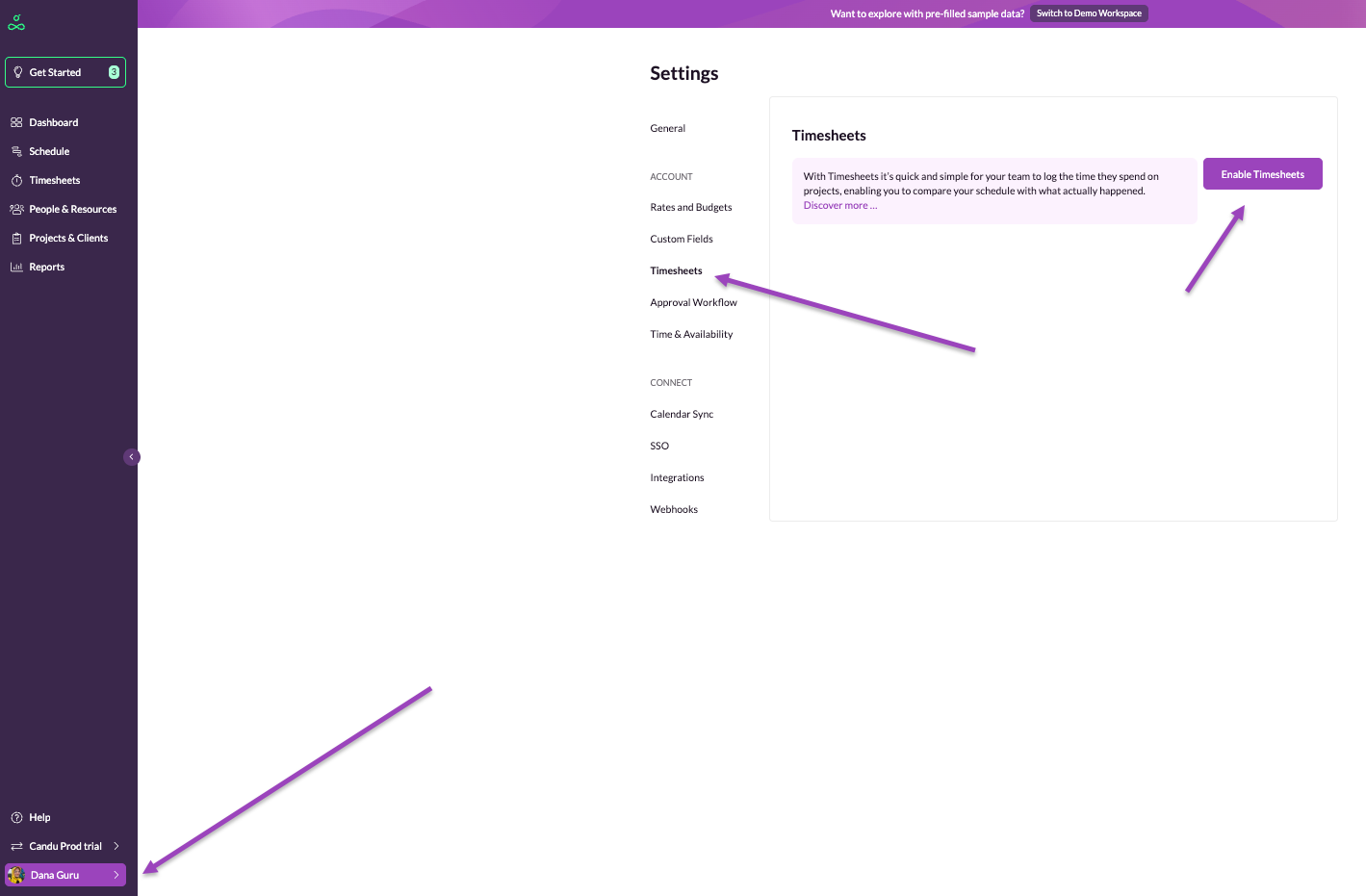 Click on your profile picture at the bottom left corner and then select Settings > Timesheets > Enable Timesheets.