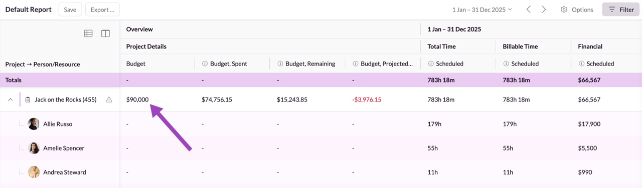 Locate the Budget column to see the total budgeted hours and remaining hours over the entire project. Filter by individual projects for more detailed tracking, including time spent by each resource and remaining time you can allocate.
