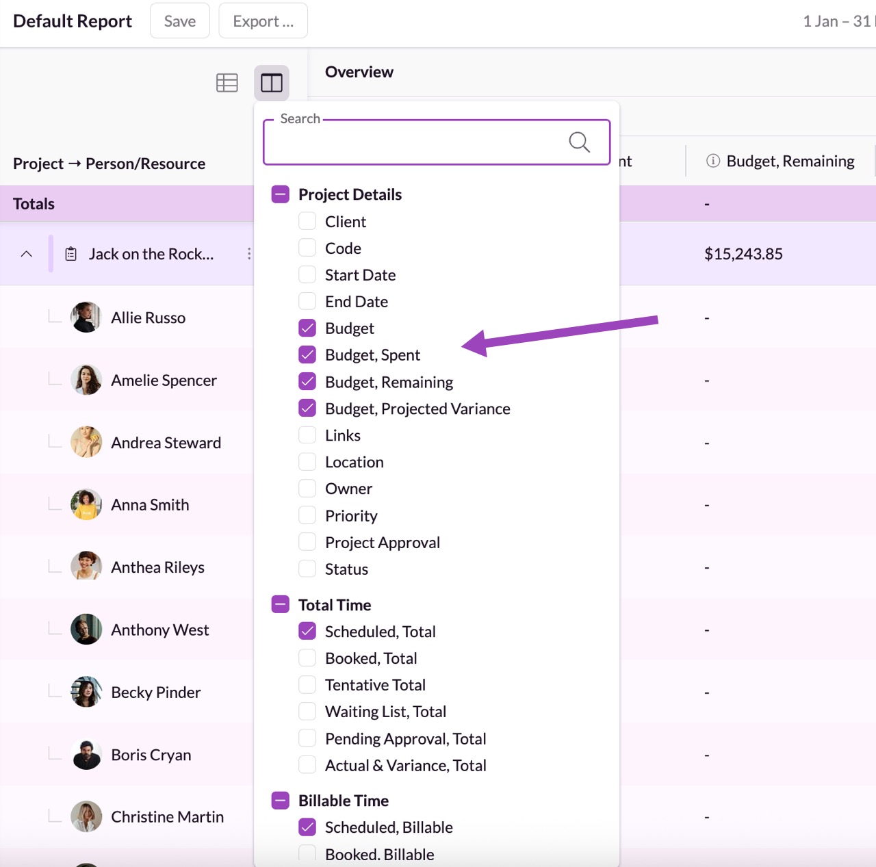 In this example, we’re creating a custom report and have included Budget details as columns within the Project Details section.