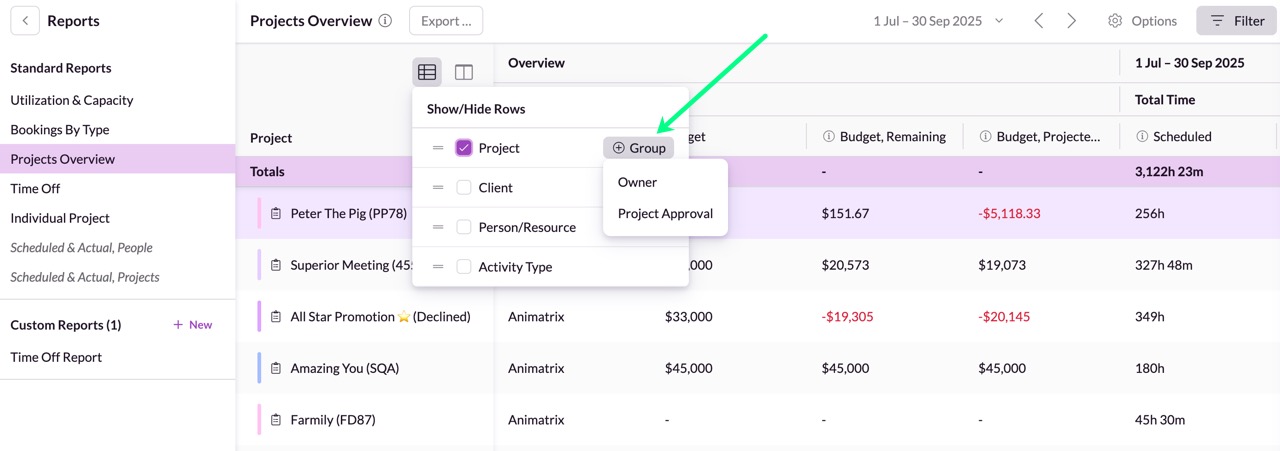 Rows control the primary level of data shown in your report—such as People, Projects, Clients or Activity Types. At each subsequent level, you can sort and filter data just as you would in the main view.