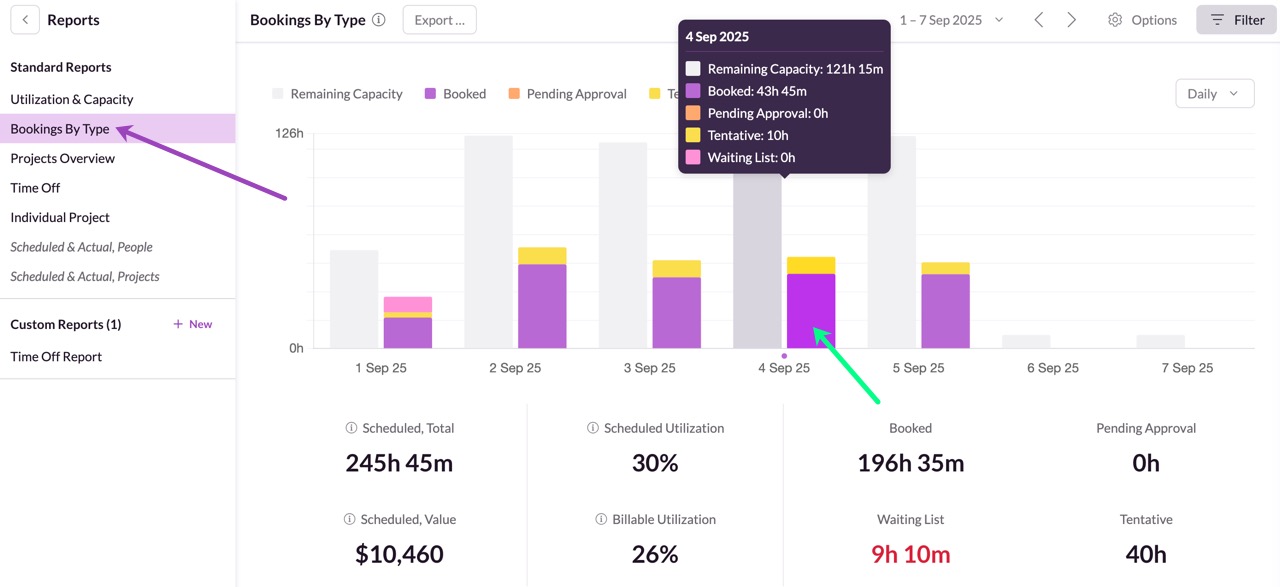 Hover over each day for a daily breakdown of utilization and capacity. Include or exclude e.g. Remaining Capacity or other options from the list above.