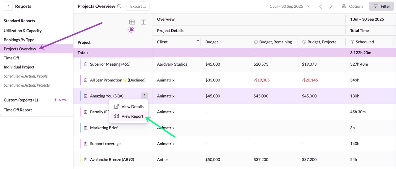 Use these two reports side by side to compare a team's scheduled utilization versus their actual logged hours.